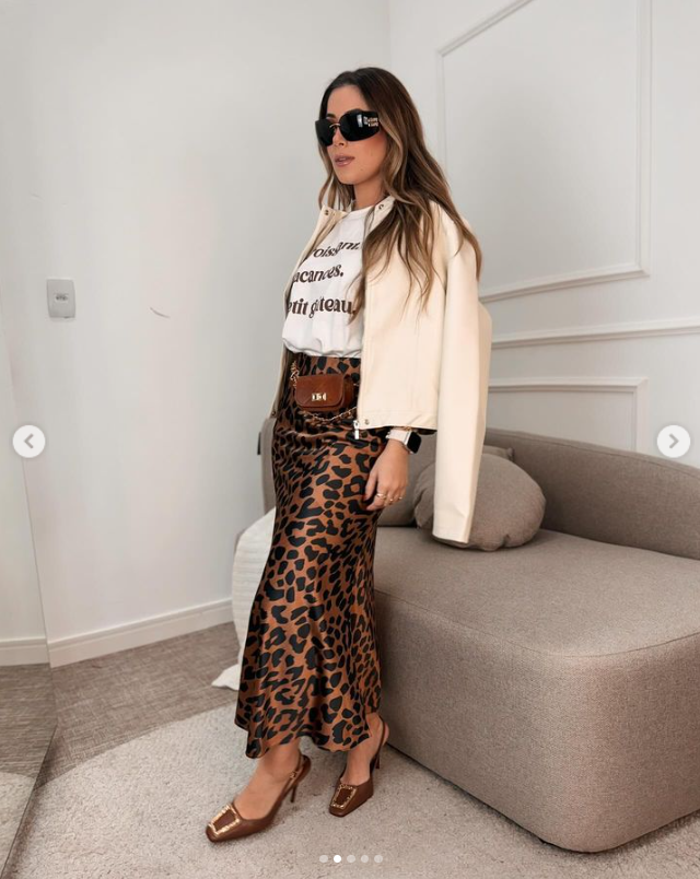 Para um look casual mas estiloso, combine a saia de cetim com camisetas básicas, tênis ou sandálias. É uma ótima opção para passeios e encontros descontraídos.